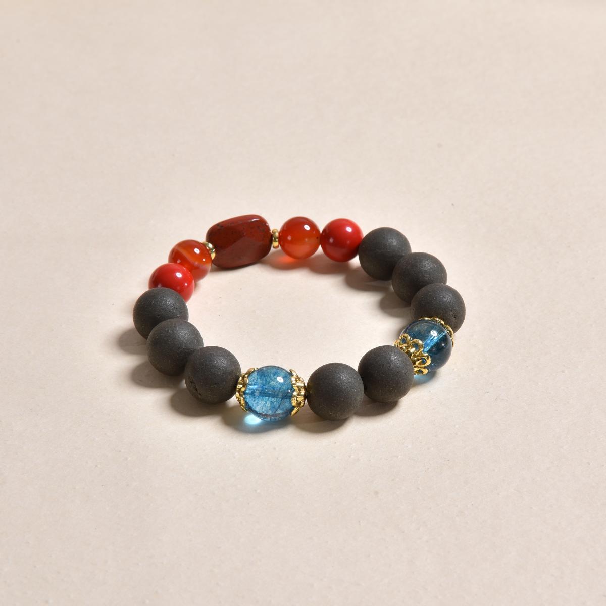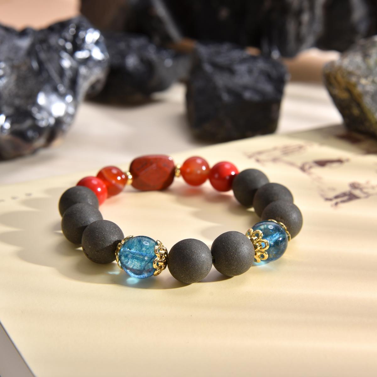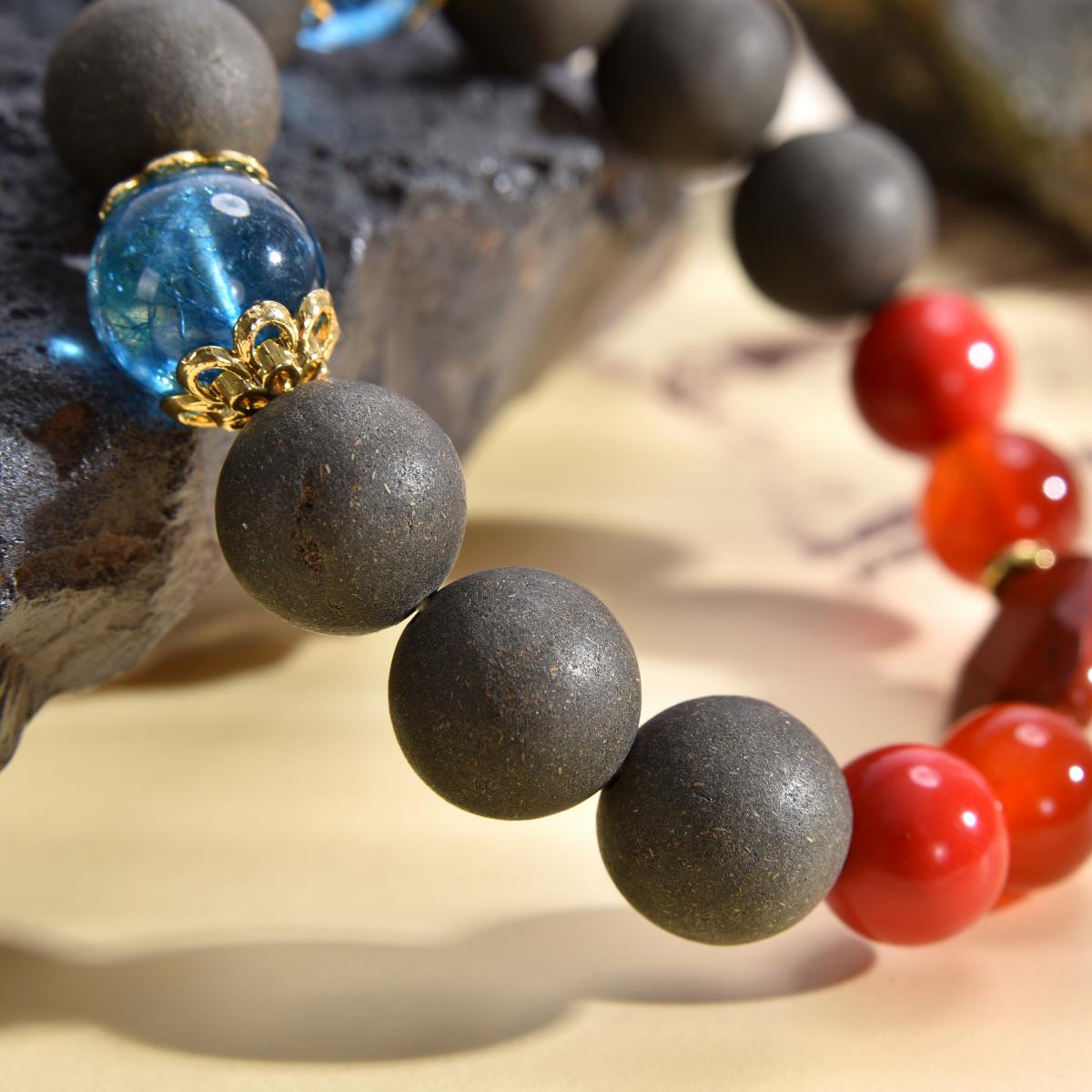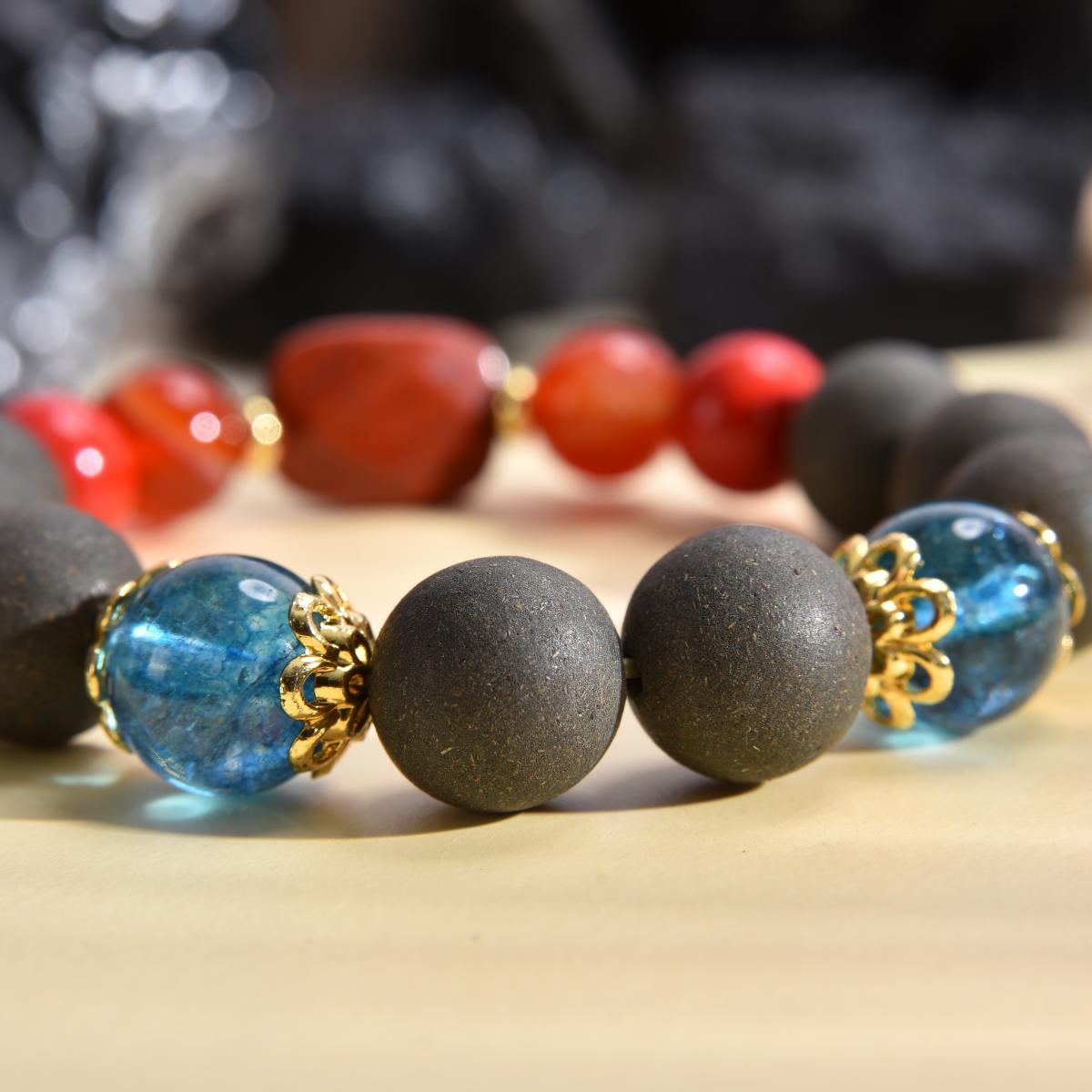 Black incense beads complement blue crystals and red agates, with interwoven colorful hues implying passion and romance.